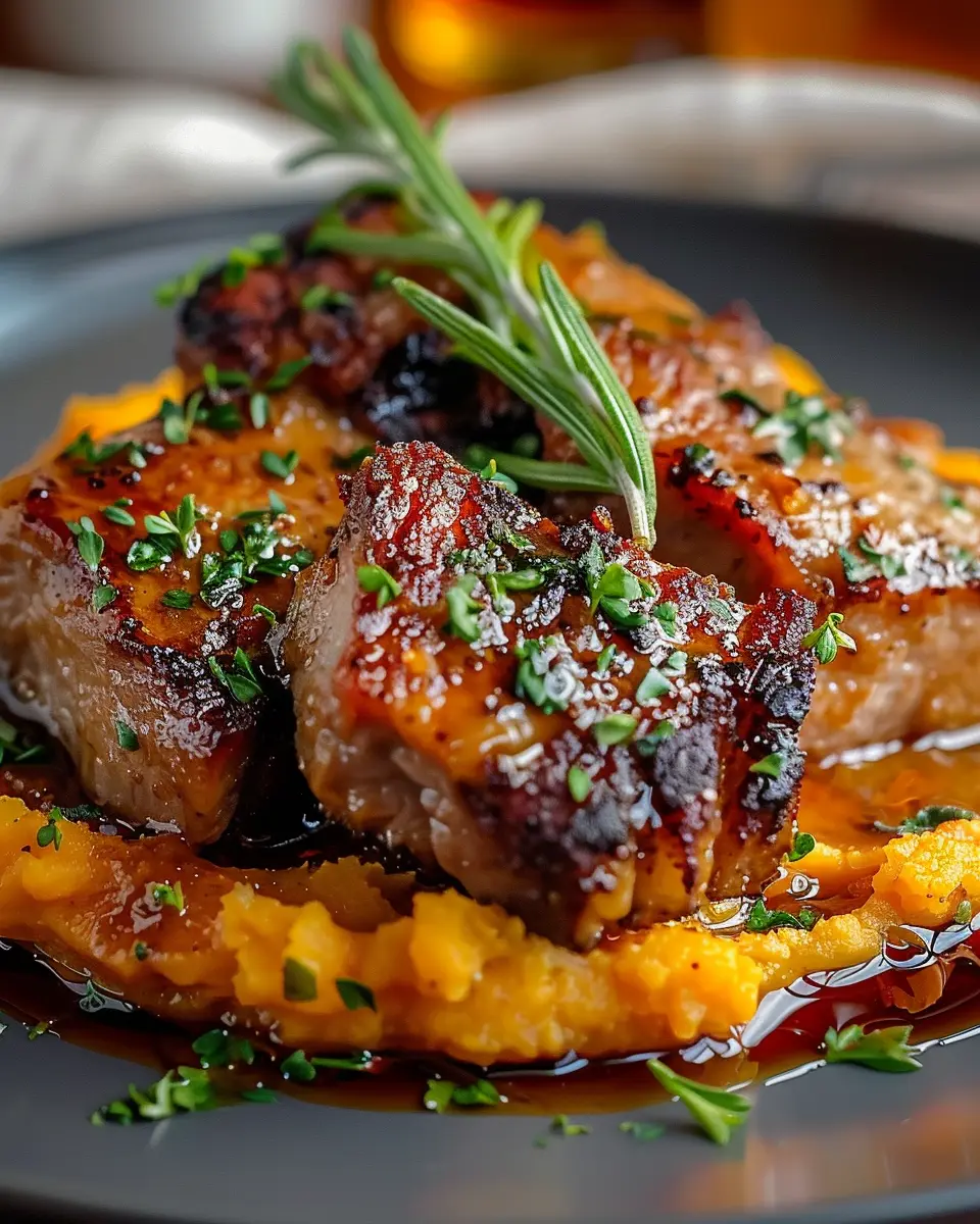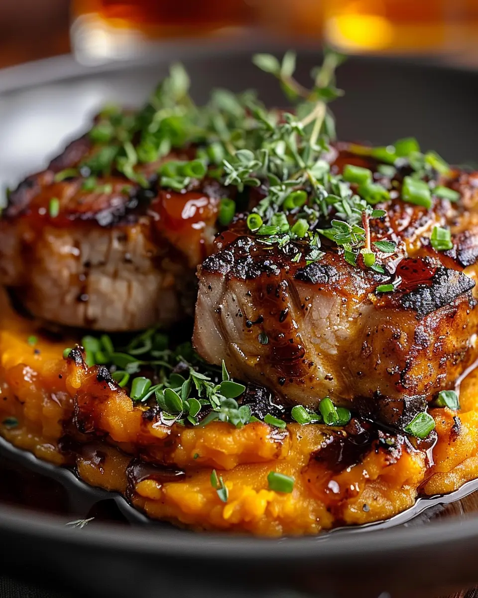 Enjoy a delightful combination of apple cider pork served with the creamiest mashed sweet potatoes. This recipe is perfect for a cozy dinner.