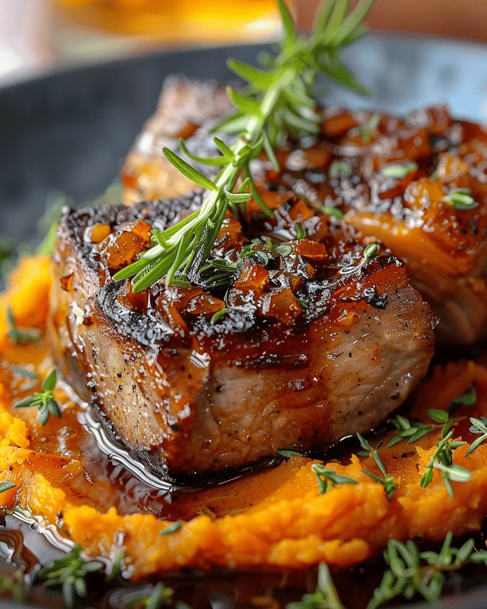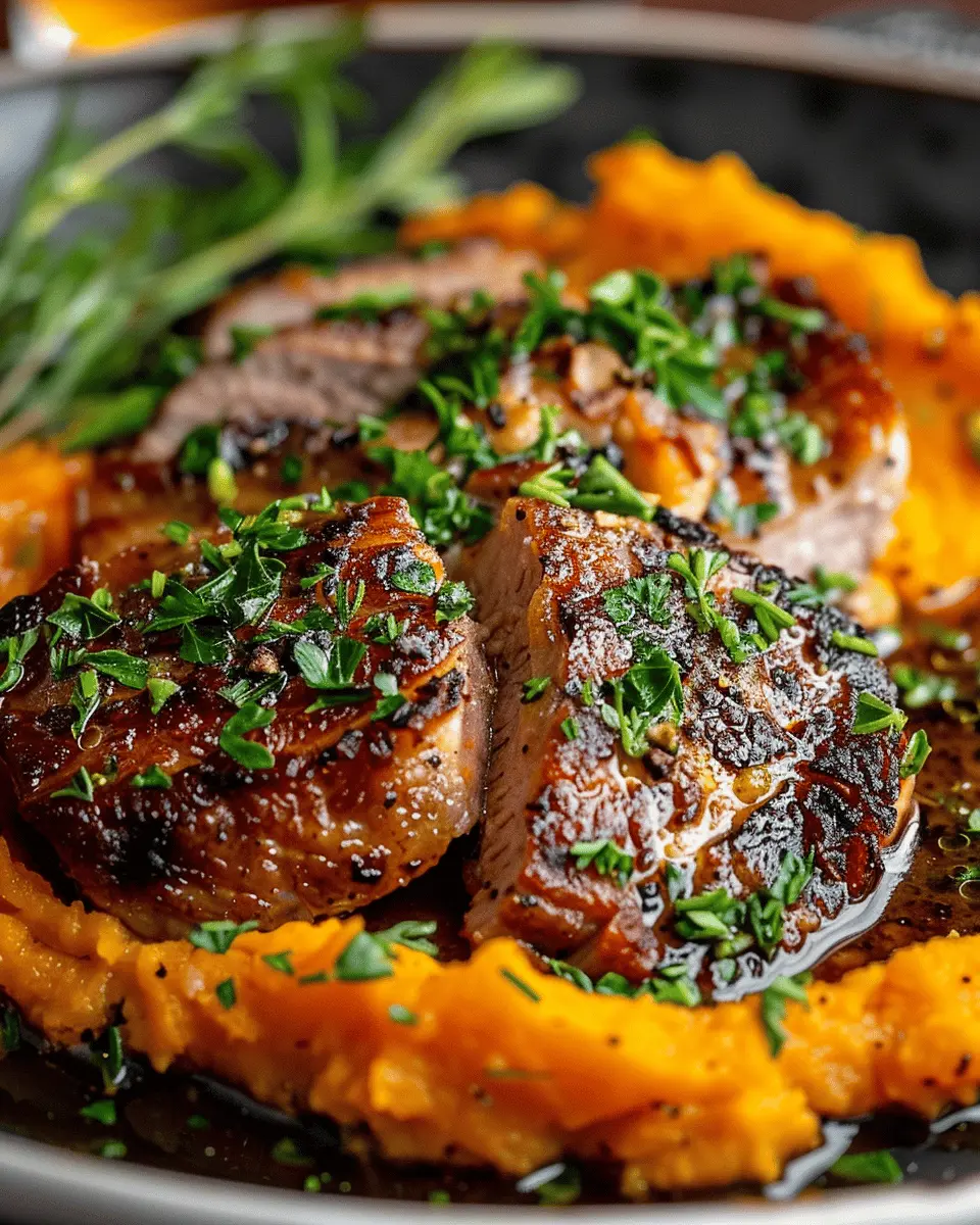 At last, it’s time to plate your masterpiece! Start by creating a generous base of mashed sweet potatoes and place the beautifully seared apple cider pork on top. Drizzle the flavorful sauce over the beef, and garnish with fresh herbs like parsley or thyme for that gourmet touch.