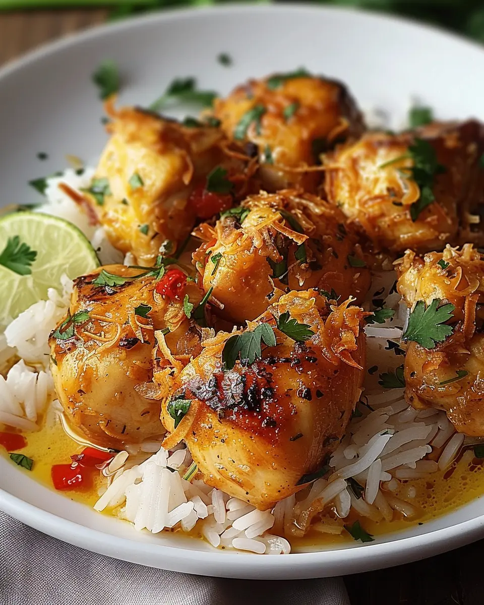 • Layering: Serve the coconut chicken atop a bed of coconut rice, garnished with fresh cilantro and lime wedges. This not only looks appealing but adds layers of flavor.
