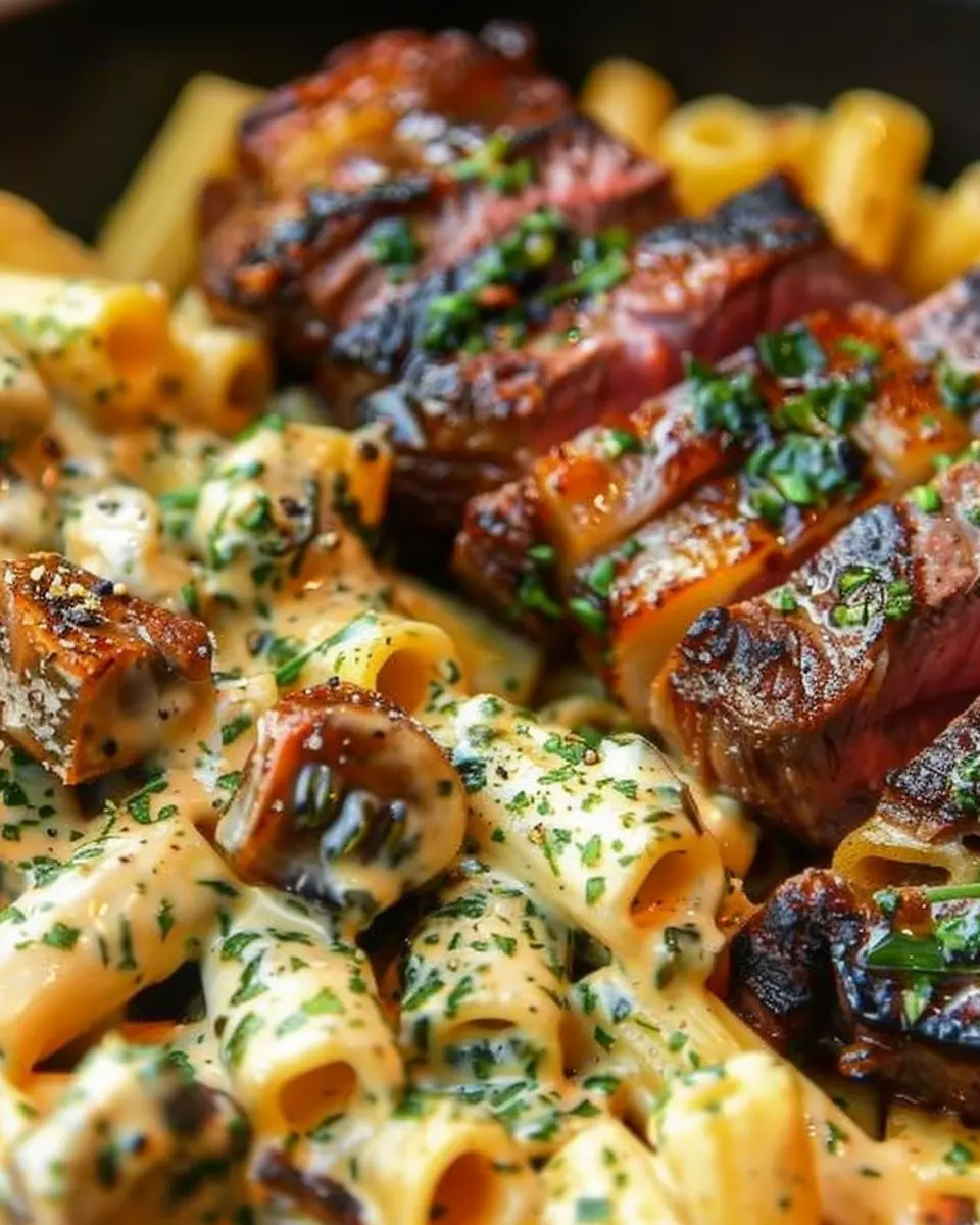 - Slice the steak and serve on top of the creamy rigatoni. Garnish with fresh parsley.