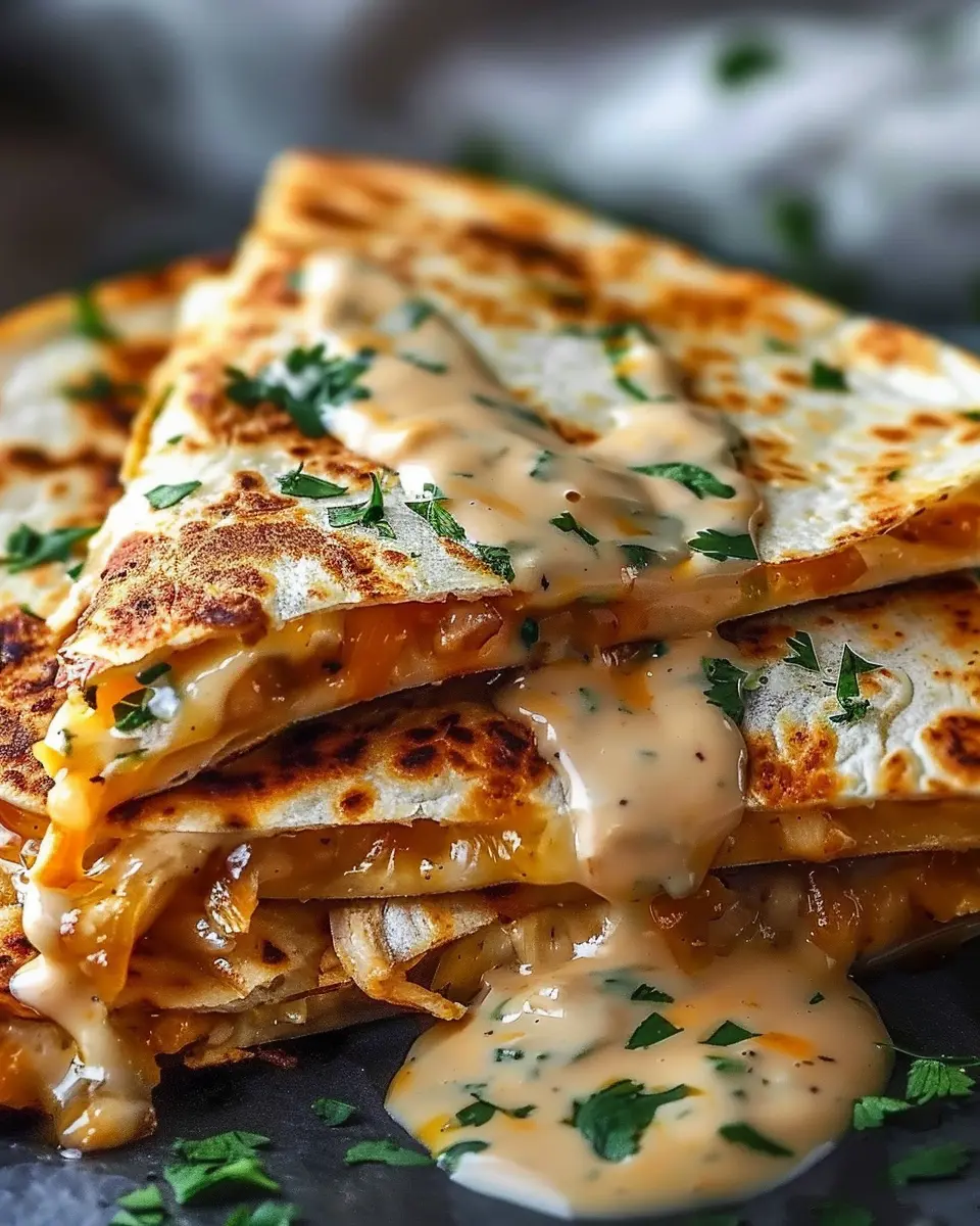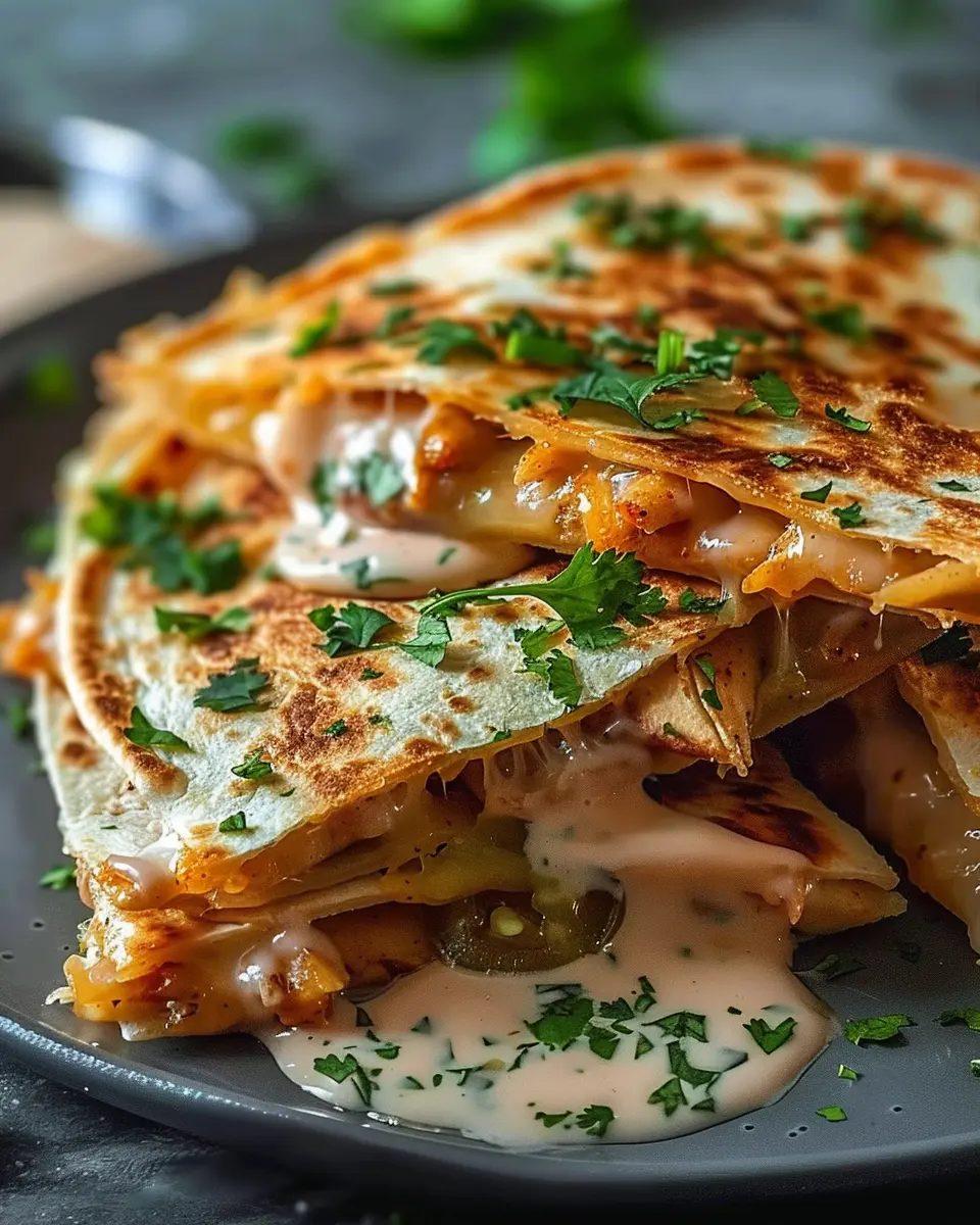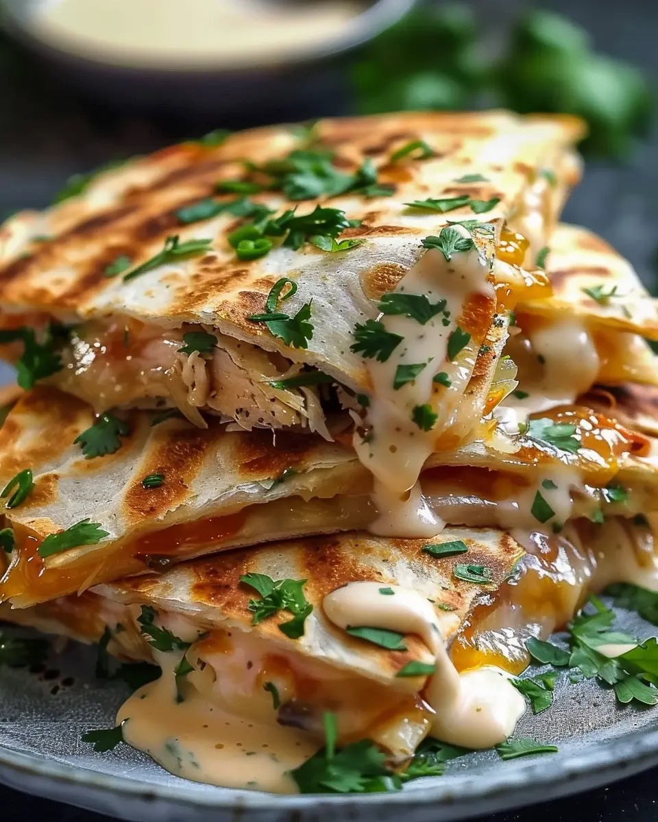 PrintCheesy Hot Honey Chicken Quesadillas with Spicy Jalapeño Cream Sauce Recipe to Delight Your Taste Buds