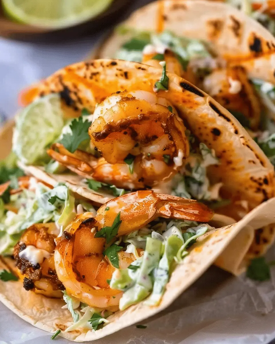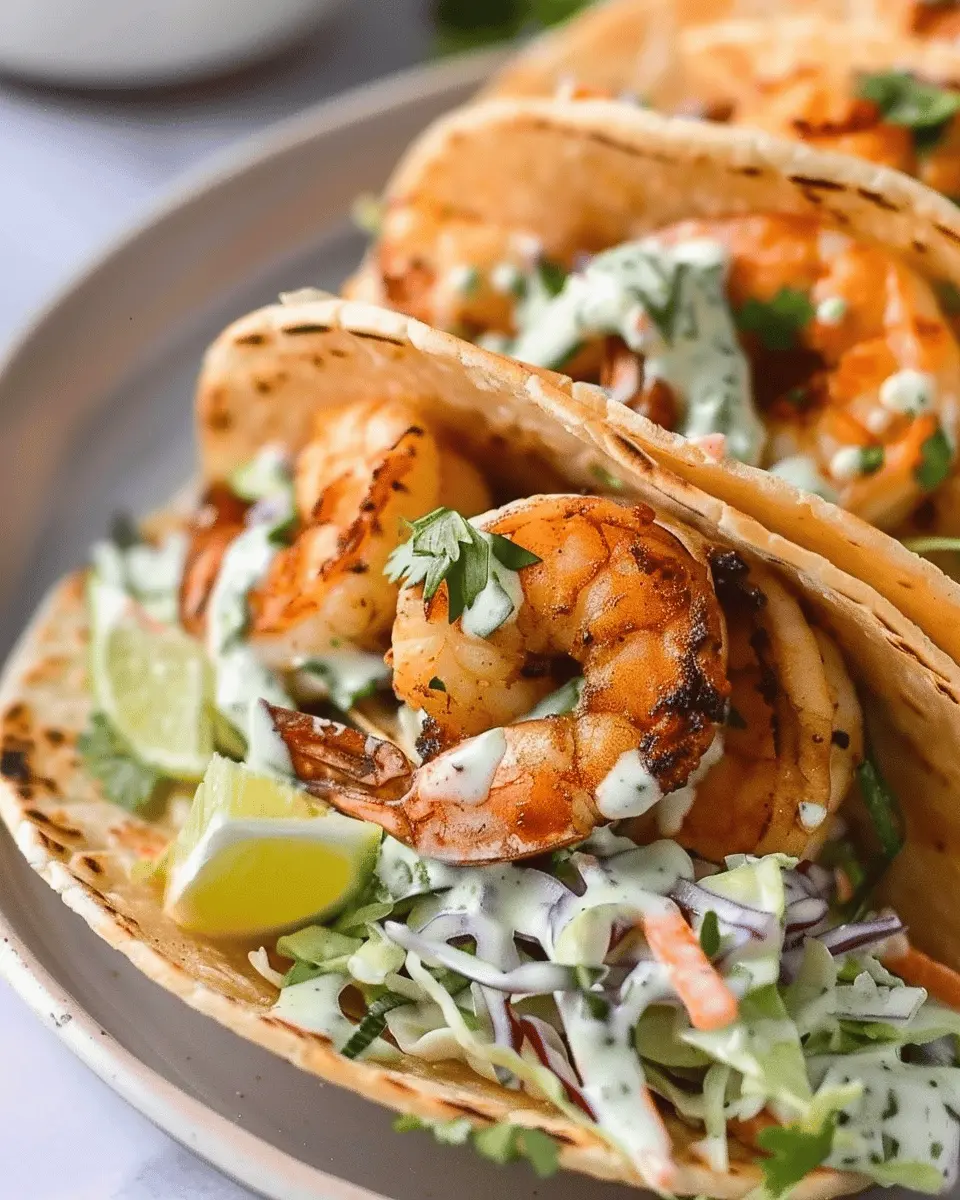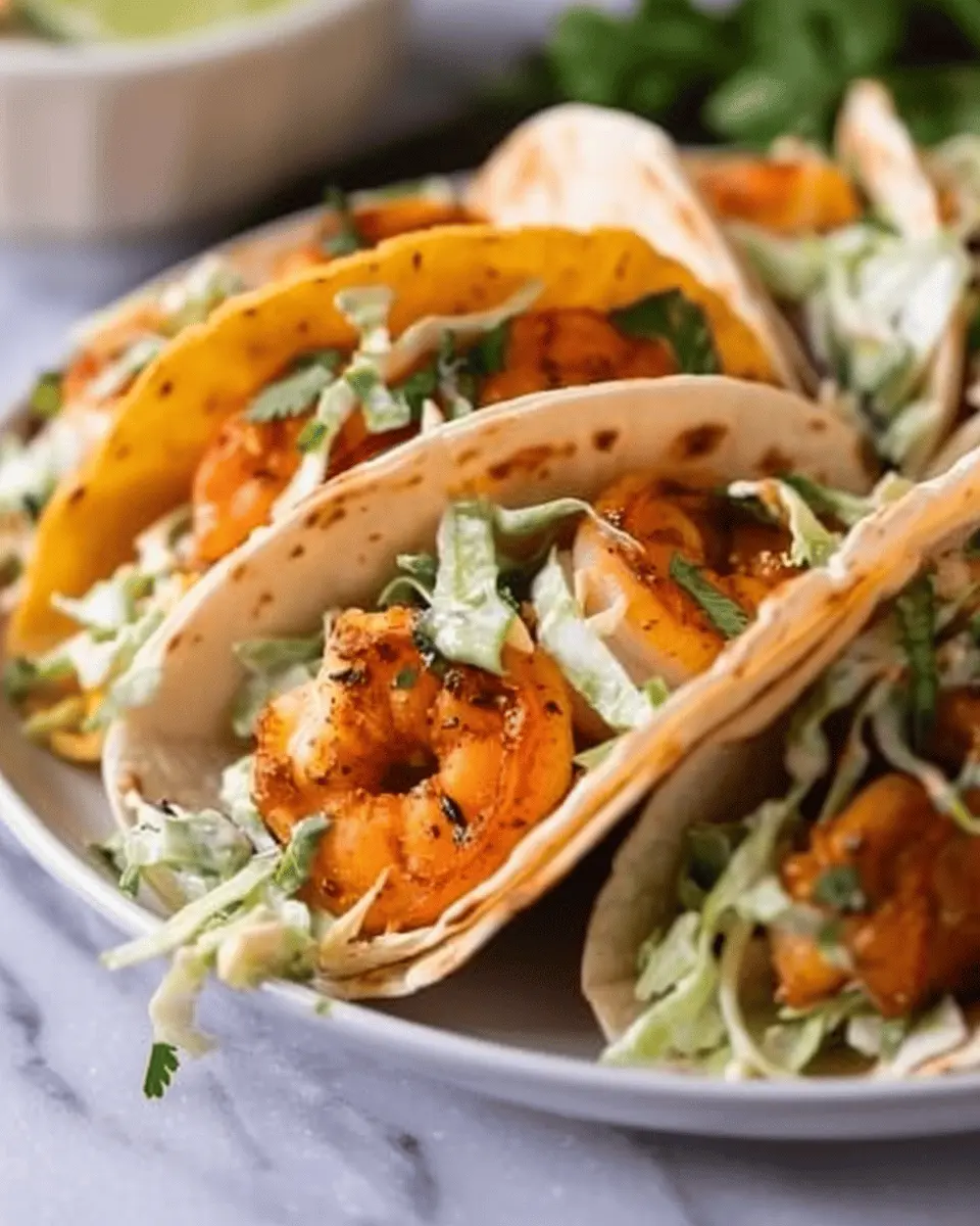 - Assemble tacos by placing shrimp in tortillas and topping with creamy slaw.