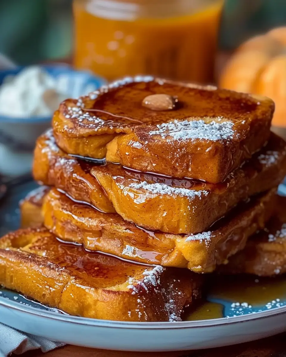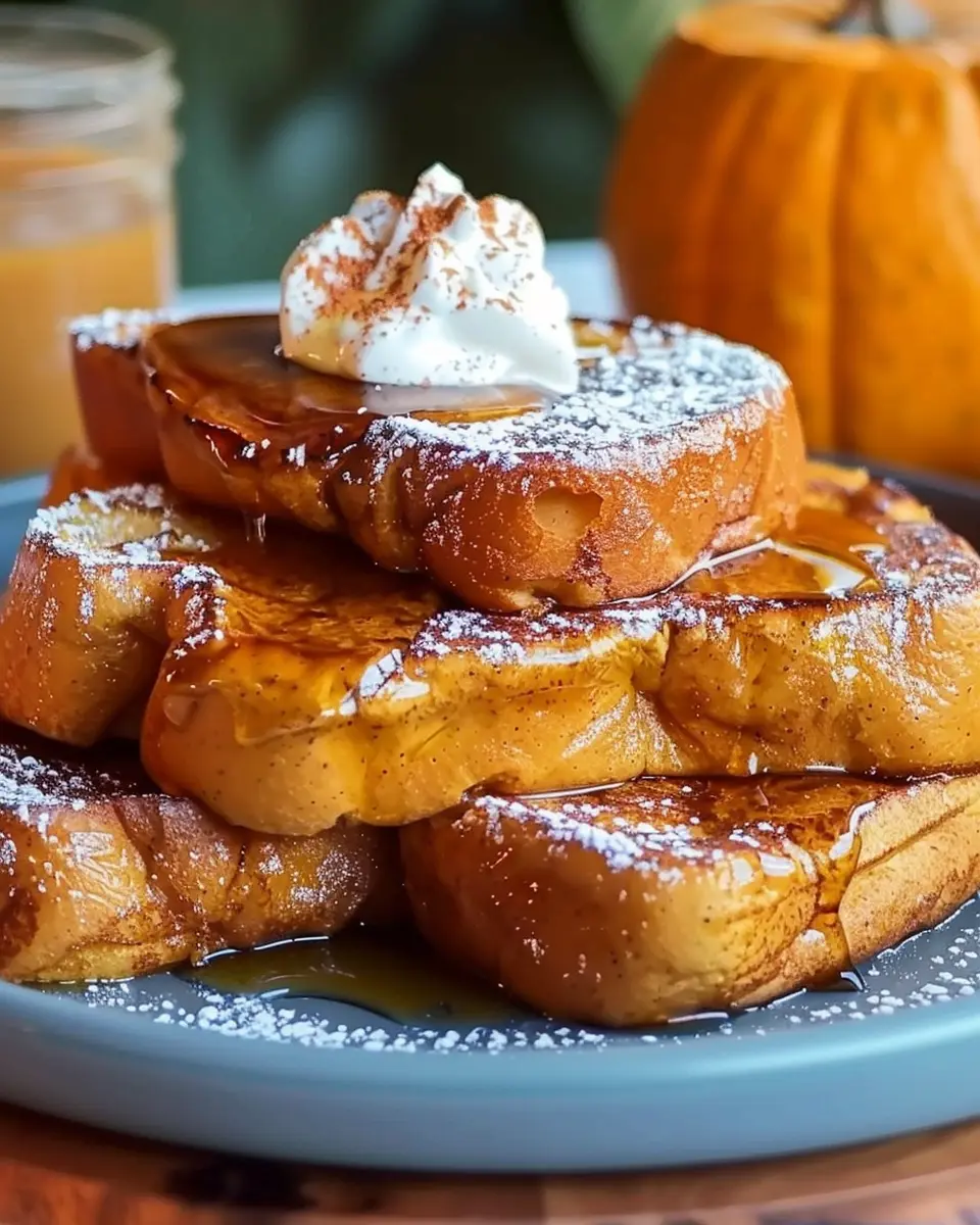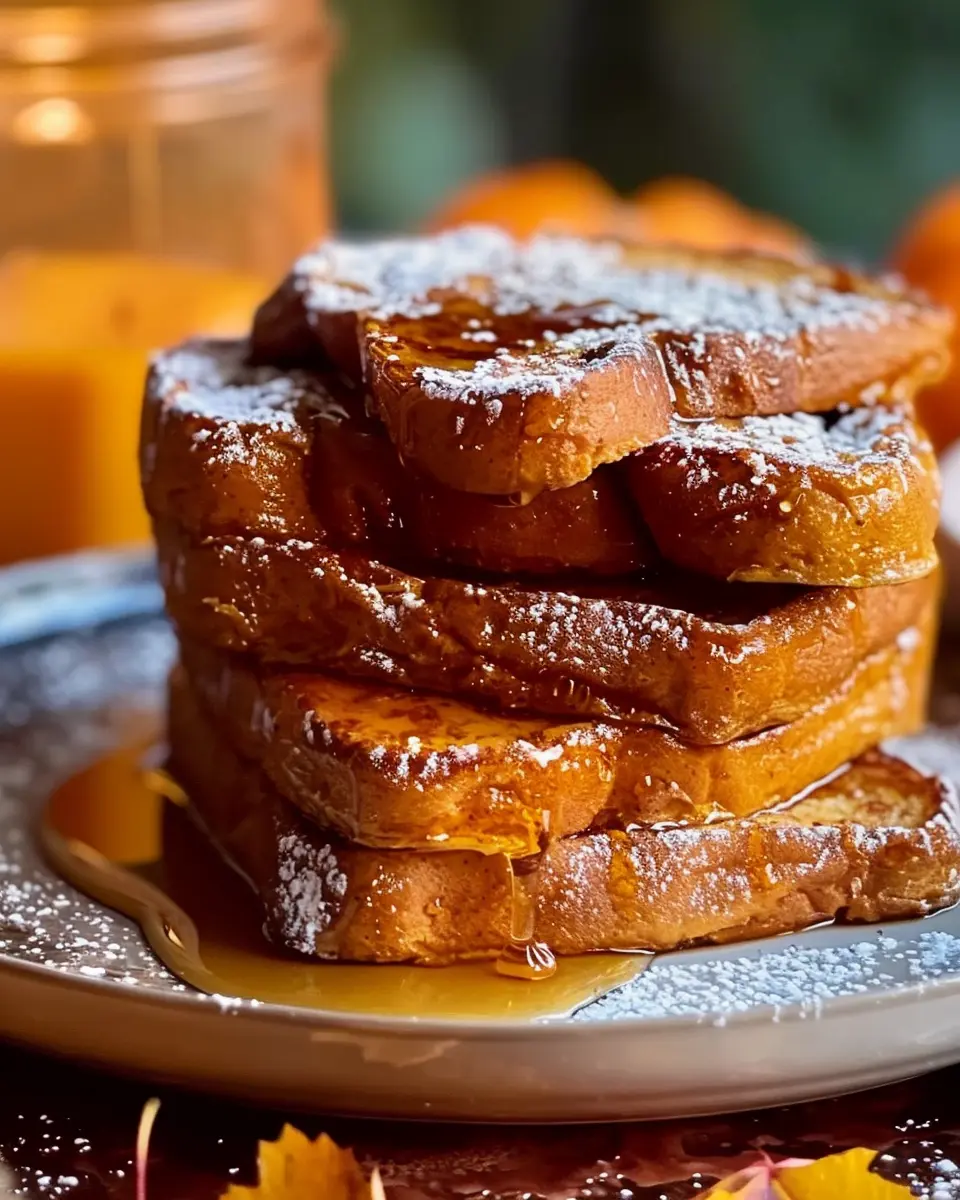 Once your Cozy Friendsgiving Pumpkin-Spiced French Toast is perfectly cooked, it’s time to plate it up! Stack the slices on a serving platter and get creative with toppings.