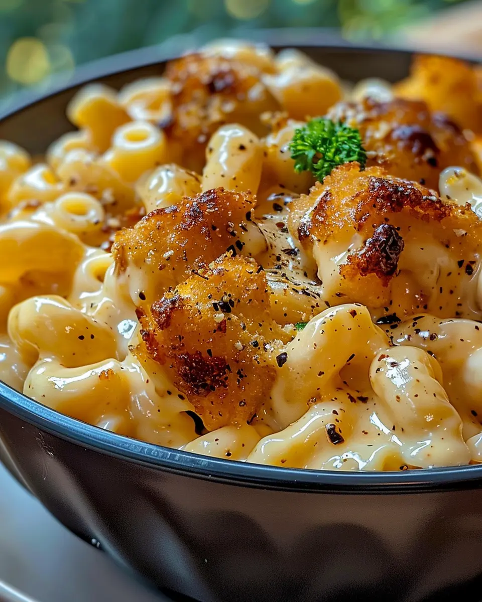 A delicious and indulgent twist on classic mac and cheese, featuring creamy sauce, honey, and pepper chicken.
