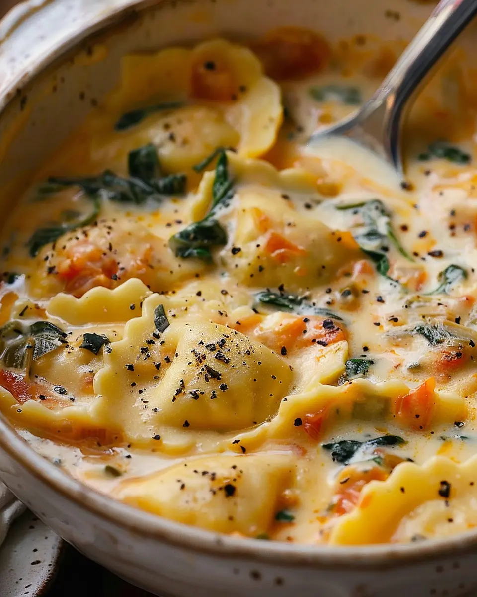 A rich and creamy soup filled with delicious ravioli, perfect for chilly nights.
