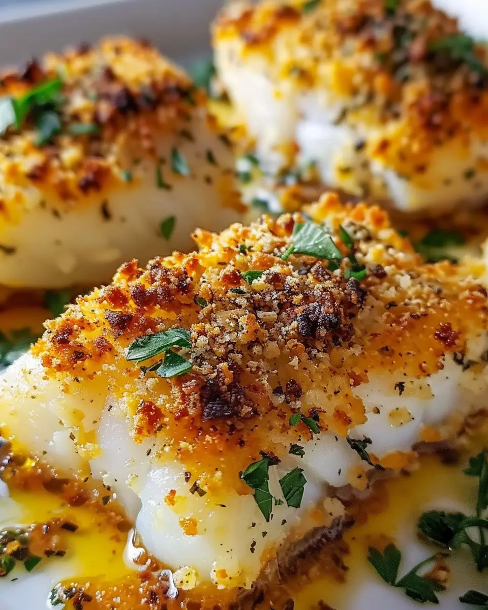 PrintGarlic Butter Cod Fillets with Crispy Panko Topping: Easy & Delicious
