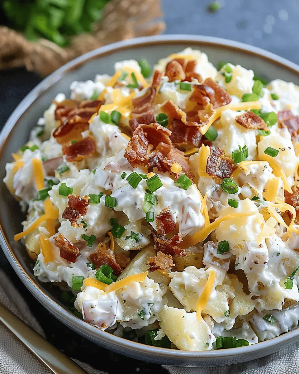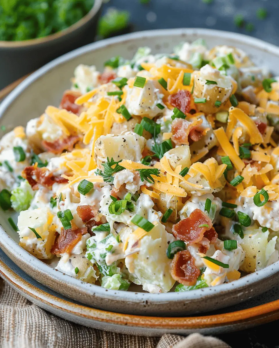 Absolutely! One of the best parts about the loaded baked potato salad recipe is that it can be prepared ahead of time. In fact, letting the salad sit in the fridge for a few hours (or even overnight) allows the flavors to meld together beautifully. Just make sure to hold off on adding any crispy toppings, like Turkey Bacon or fresh herbs, until you’re ready to serve. This keeps everything nice and crunchy!