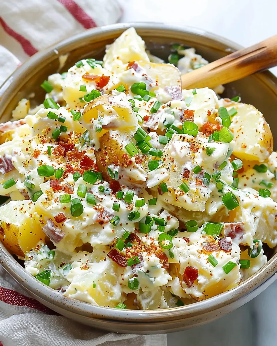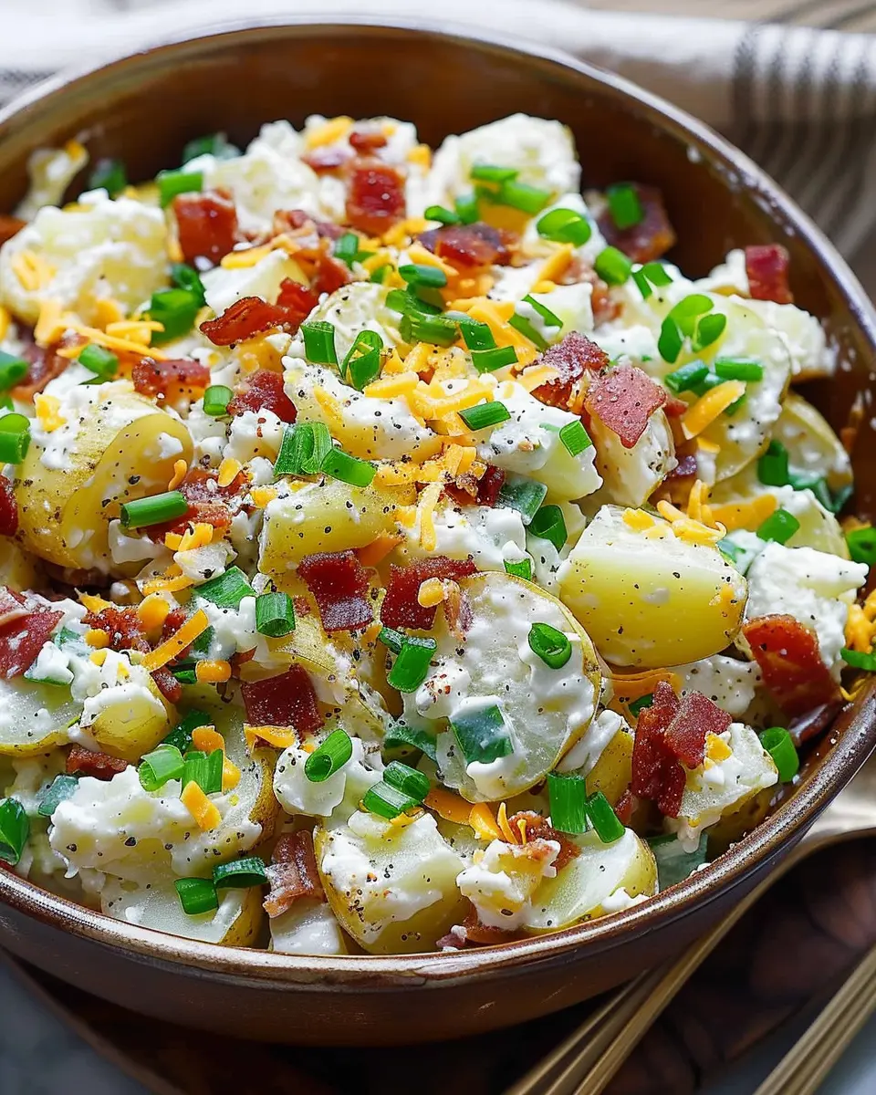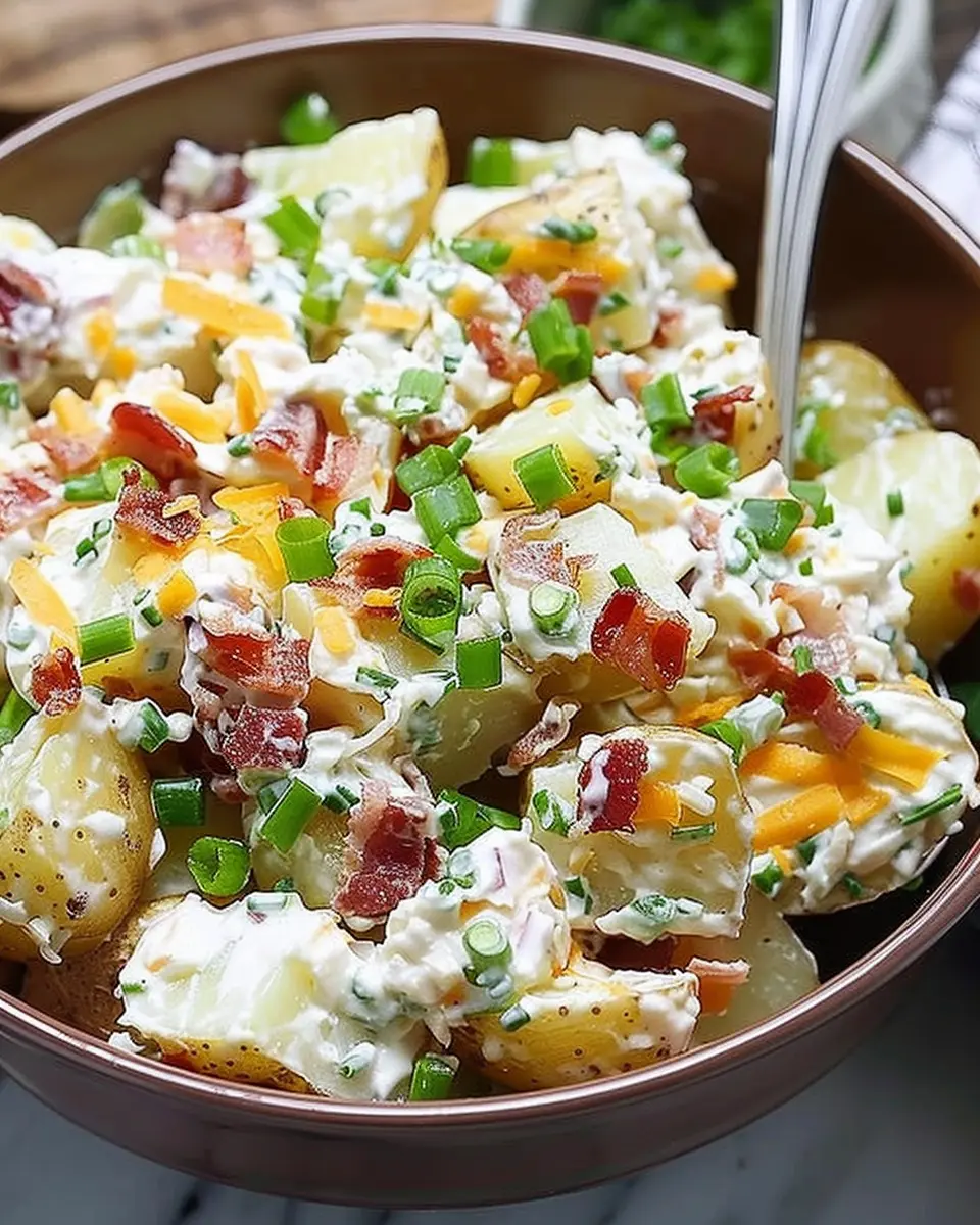 A creamy and delicious loaded baked potato salad featuring turkey bacon, perfect for any gathering.
