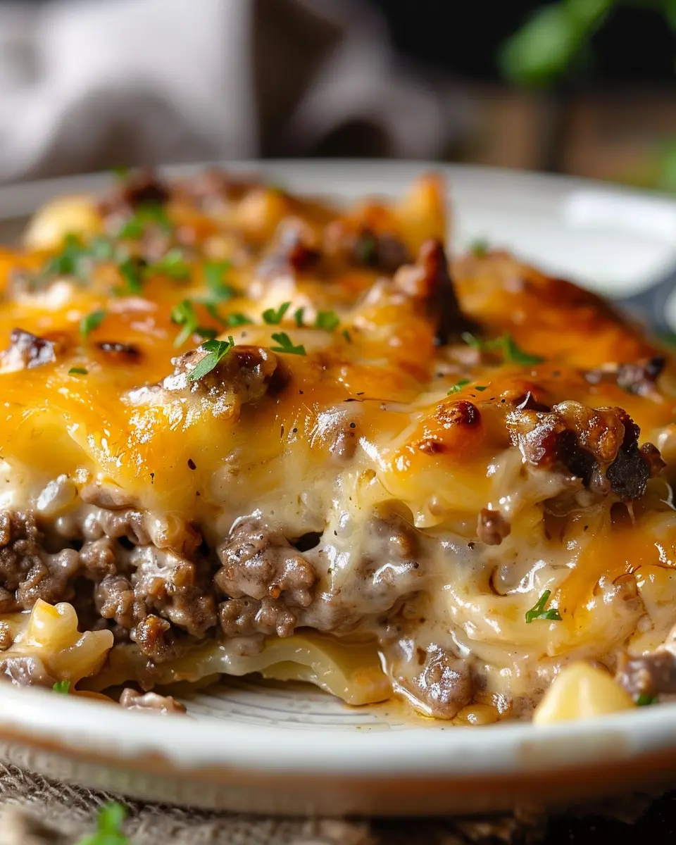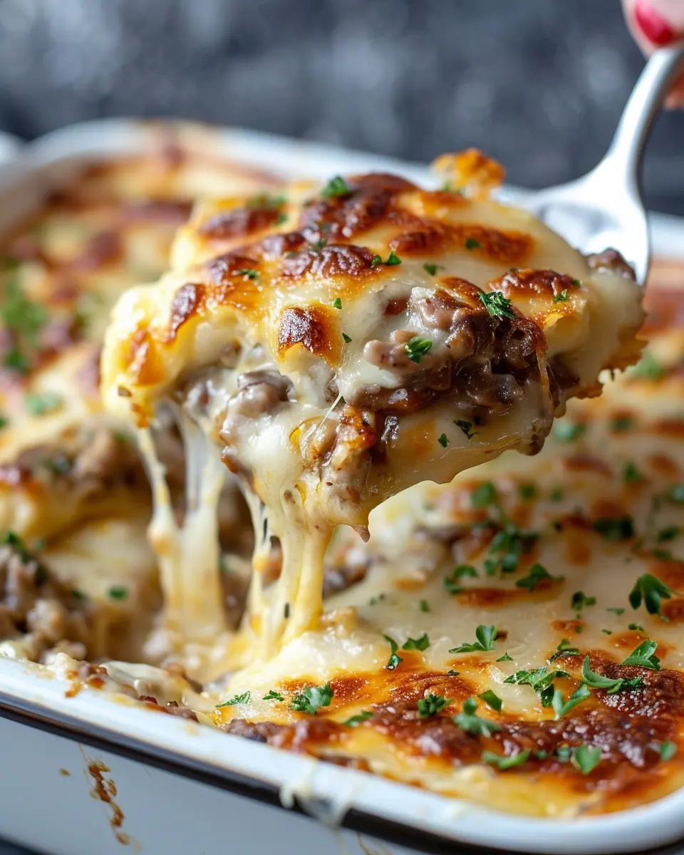 Now it’s time to assemble your casserole! Preheat your oven to 350°F (175°C). In a casserole dish, spread the beef and vegetable mixture evenly. Then layer the shredded cheddar and provolone cheeses on top. For an extra touch, you might consider adding some additional seasonings or even a sprinkle of crushed red pepper flakes for a hint of spice.