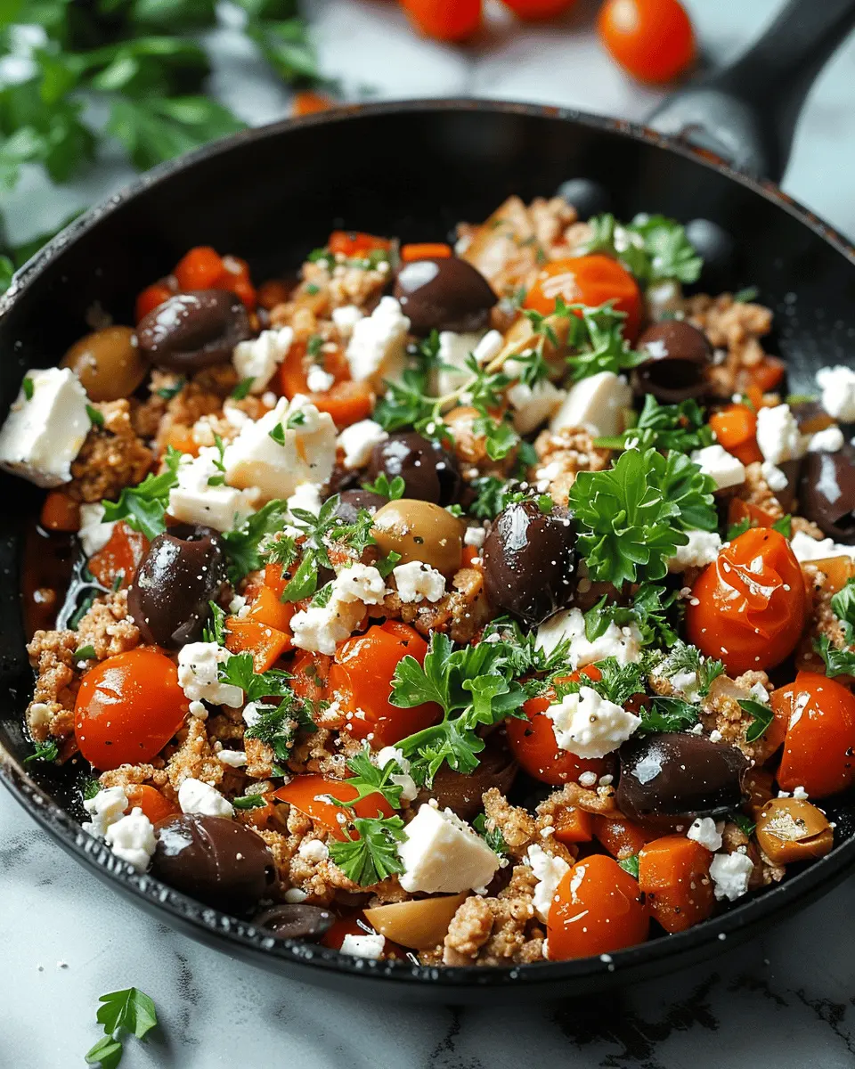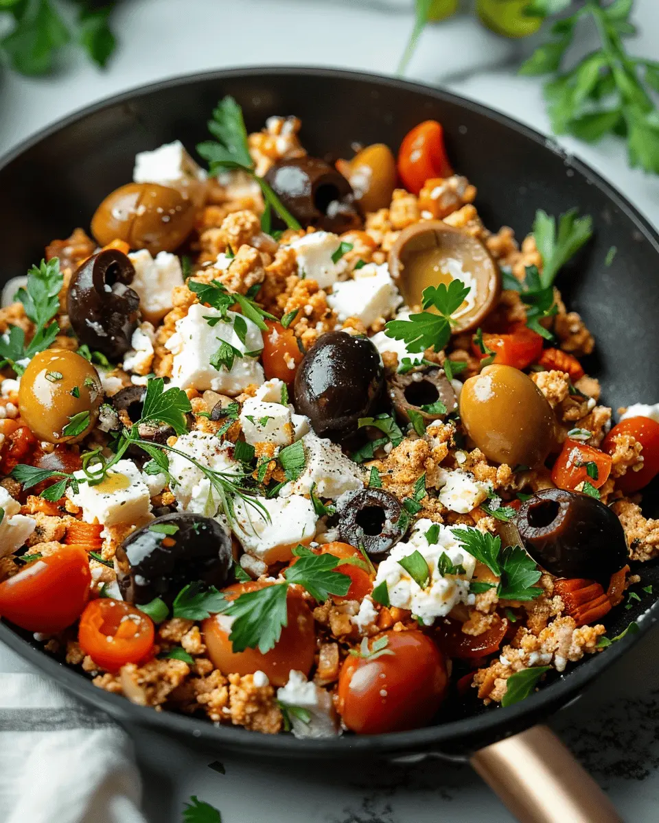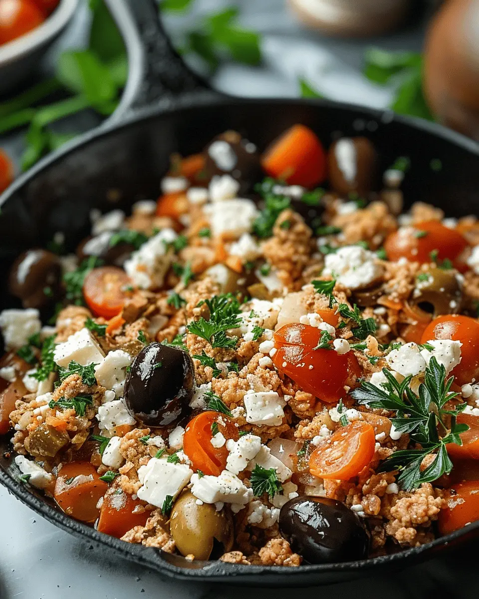 PrintMediterranean Keto Ground Chicken Skillet with Olives and Feta Magic