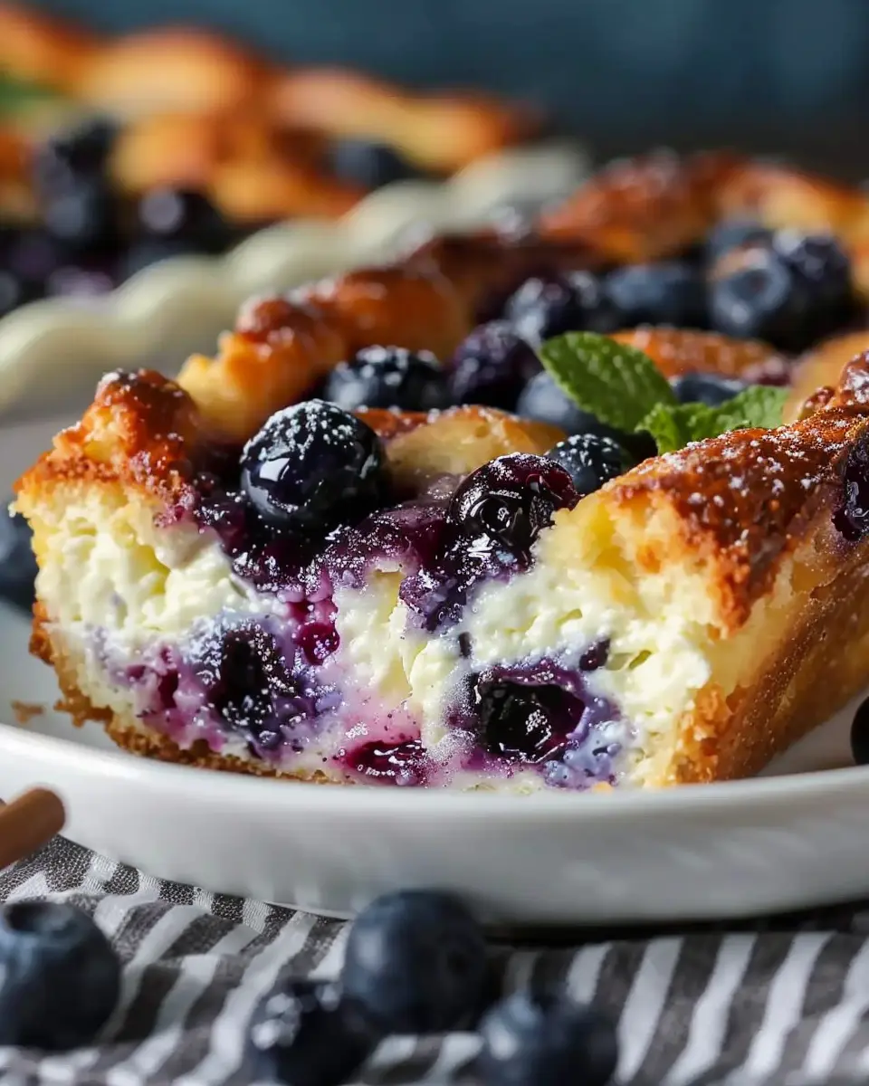 This breakfast bake is versatile; serving it warm offers a cozy, comforting feel that’s perfect for chilly mornings. The melted cheese and warm blueberries create a delightful texture.