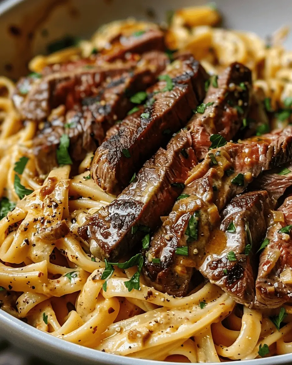 Once your pasta is cooked, drain it and add it directly to the skillet with the sauce, along with the sautéed steak. Toss everything together gently, ensuring that the pasta is well coated with that creamy, flavorful goodness.