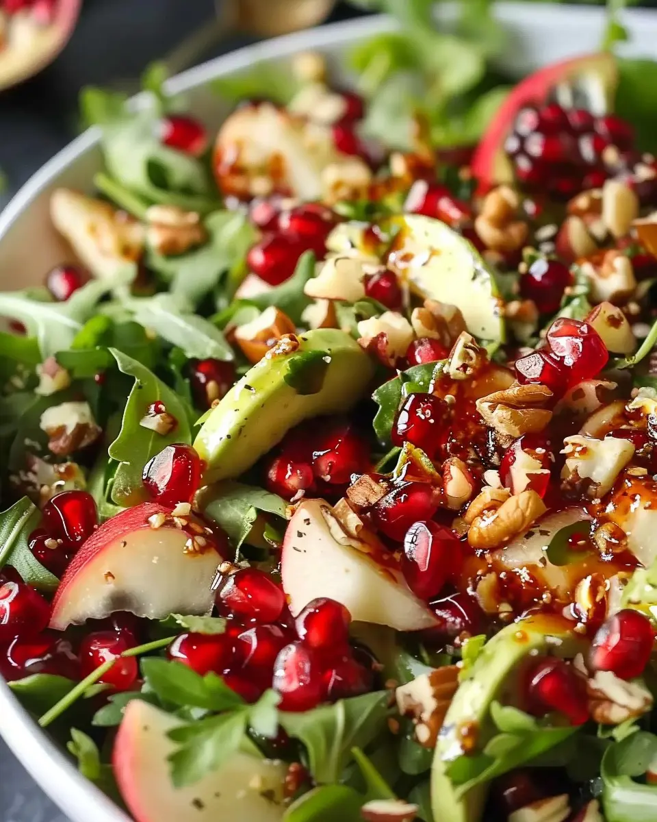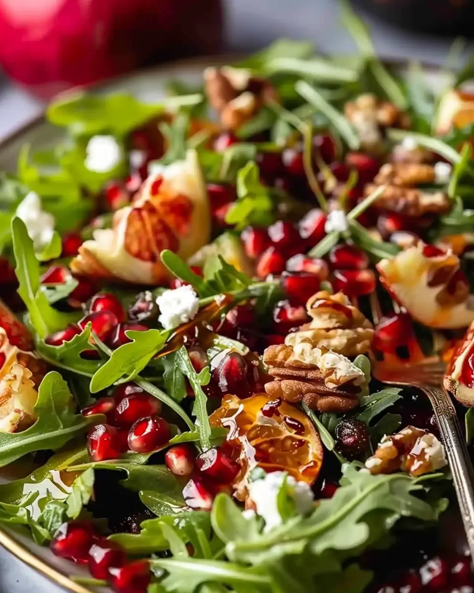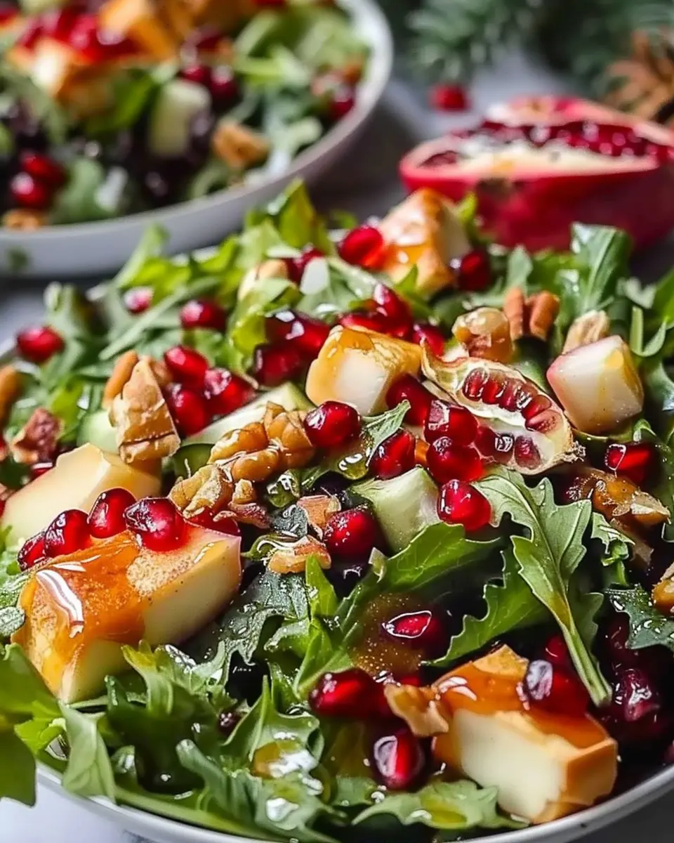 A vibrant and festive salad featuring pomegranates, perfect for holiday gatherings.