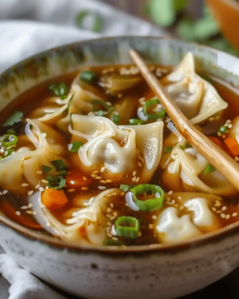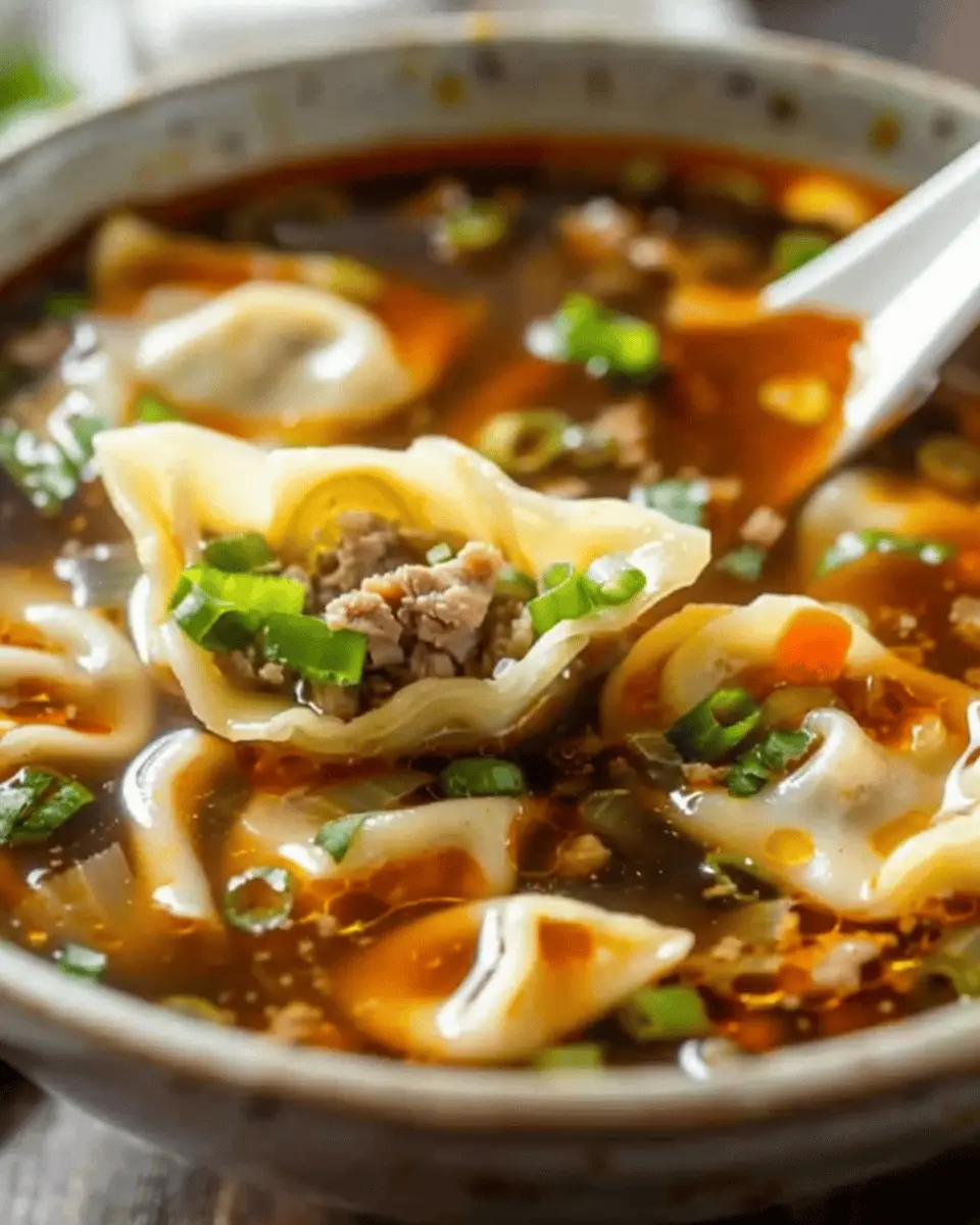 Potsticker Soup is a comforting dish featuring savory turkey bacon and chicken ham.