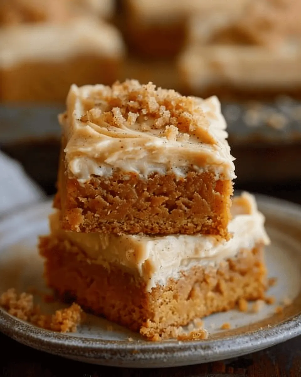 - Spread frosting on cooled pumpkin bars before slicing into squares.