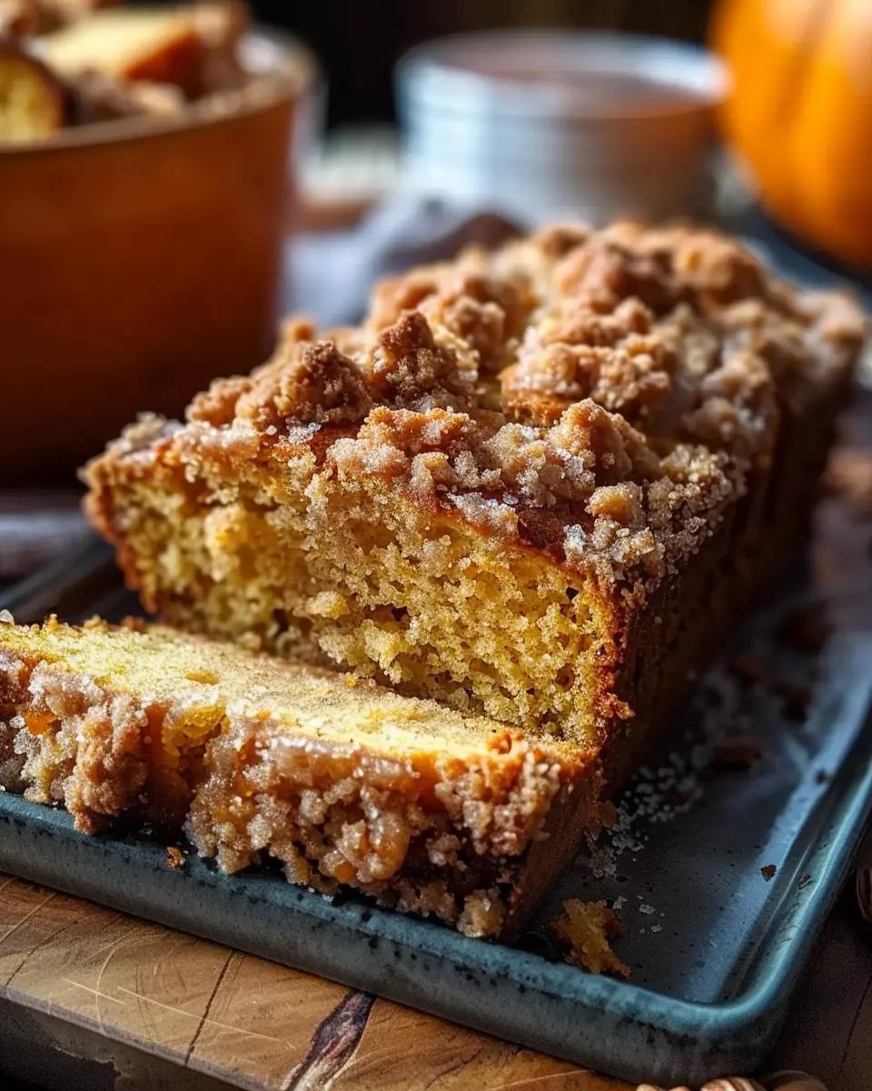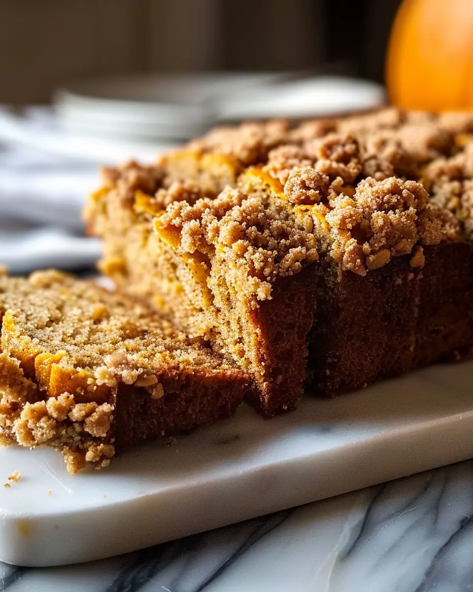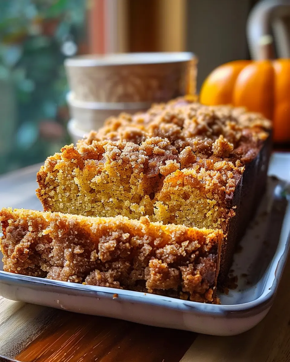 A moist and flavorful pumpkin bread topped with a delicious streusel, perfect for fall.