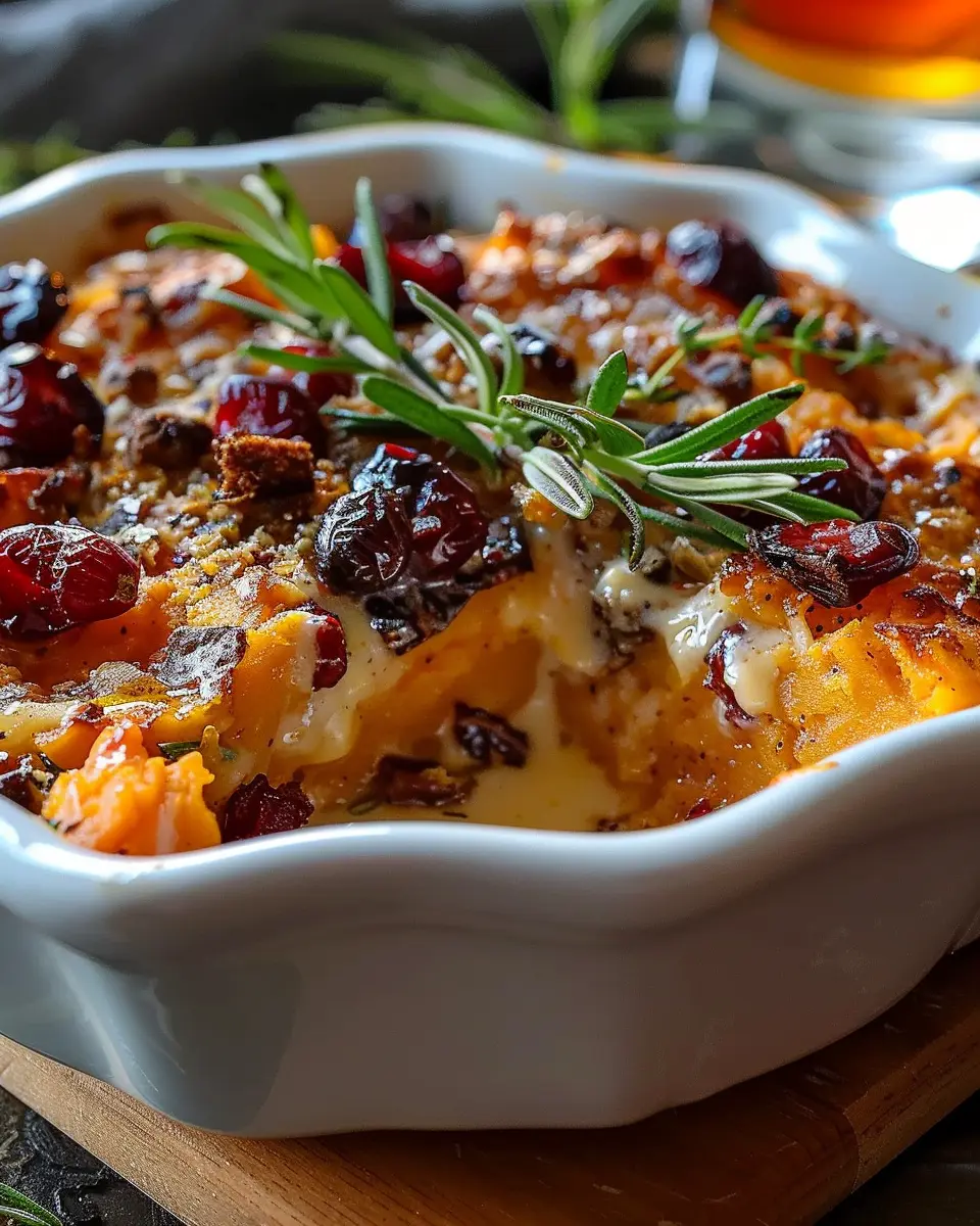 A delightful dish combining the sweetness of sweet potatoes with the tartness of cranberries, perfect for cozy gatherings.