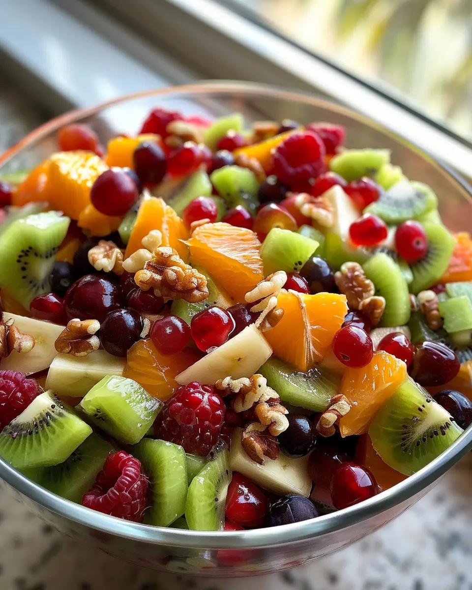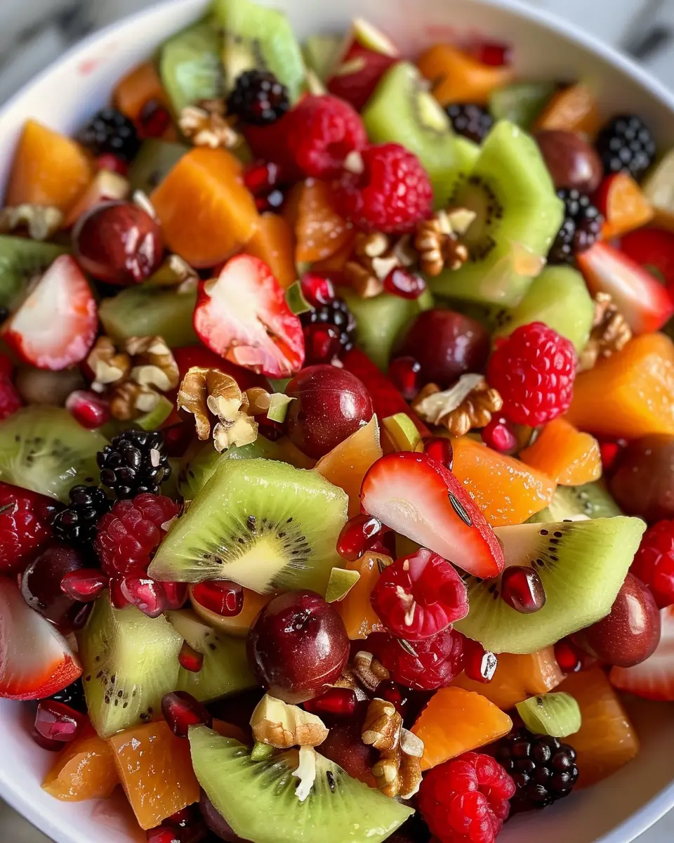 2. In a large bowl, combine the mixed berries, diced apples, mandarin oranges, grapes, pomegranate seeds, and walnuts.